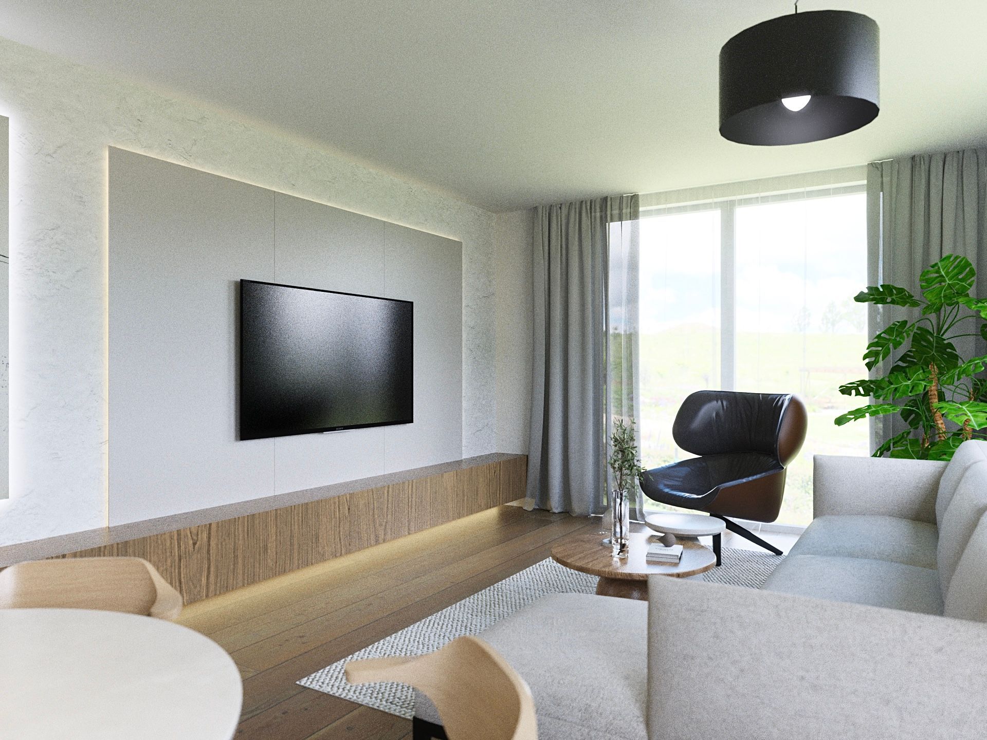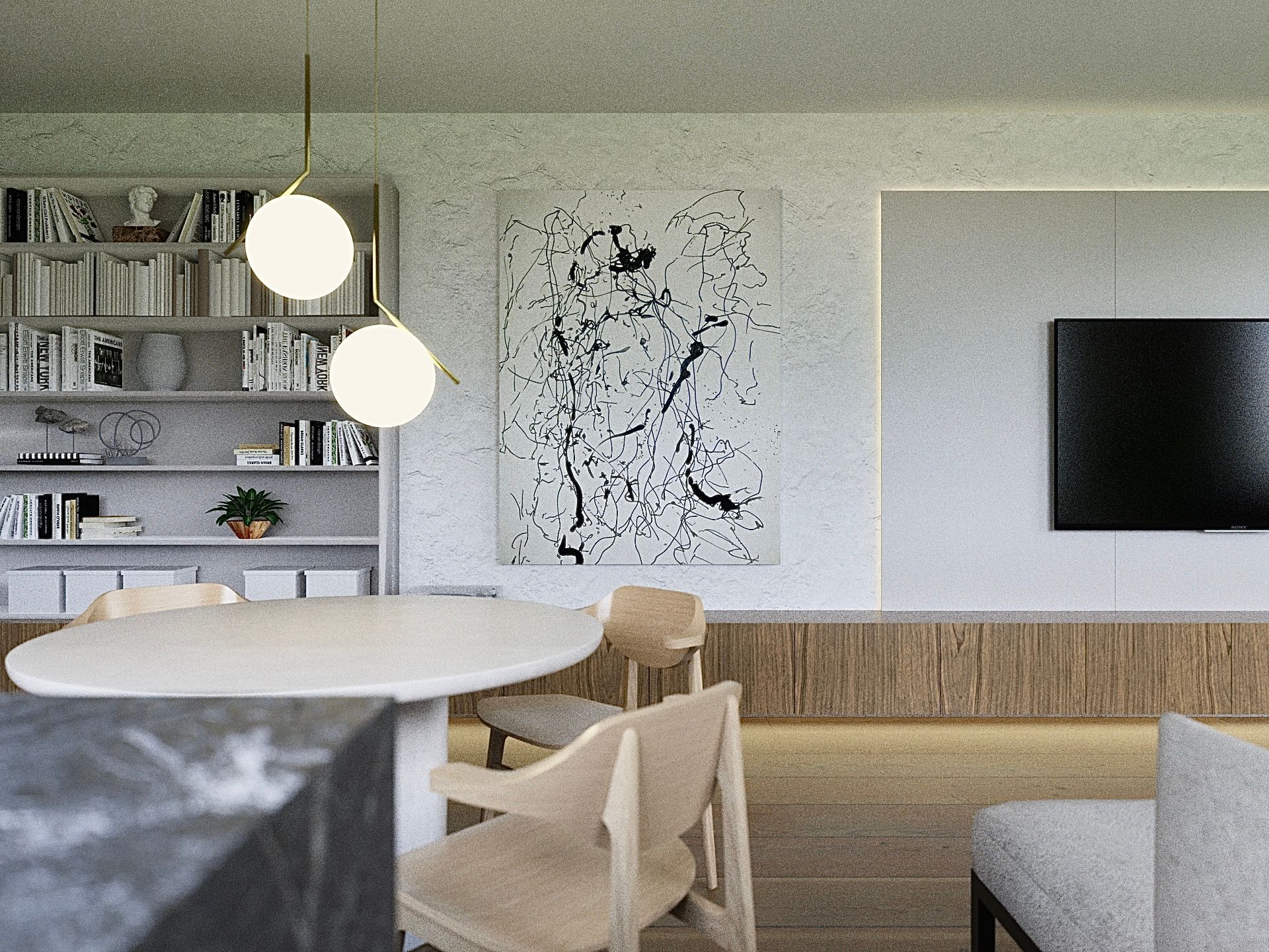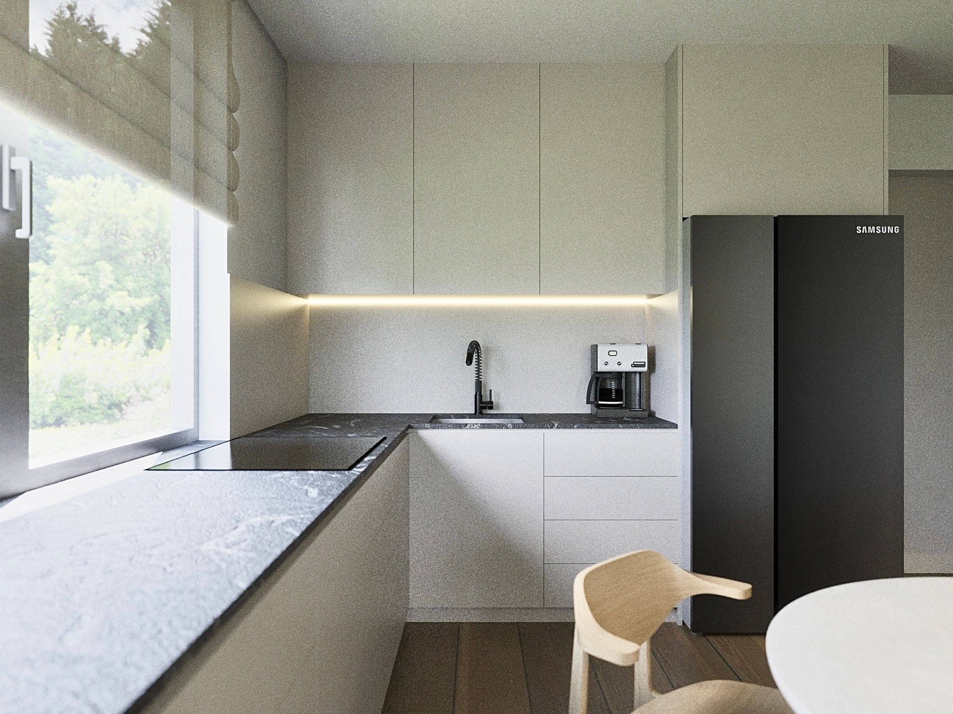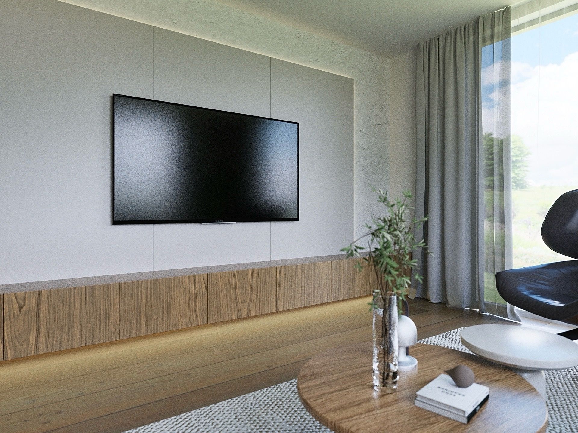 Denná časť v dome je priestor, kde rodina trávi najviac času, slúži na spoločné stolovanie, relax aj prijímanie návštev. Hoci ide menší dom, dennú časť potrebuje mať navrhnutú tak, aby spĺňala svoju funkciu a poskytovala príjemnú atmosféru domova. Kombinácia orechového dreva, béžových odtieňov a čiernych akcentov zaisťuje priestoru vzdušnosť, organickosť a rozloženie zariaďovacích prvkov zas prináša dostatok praktického využitia miestnosti.