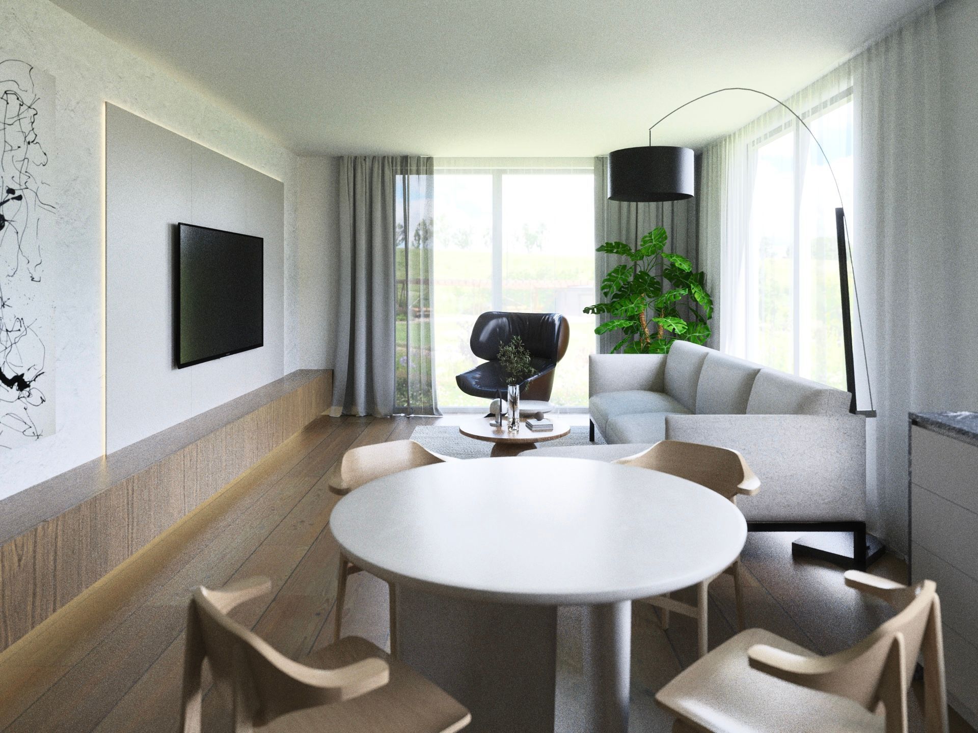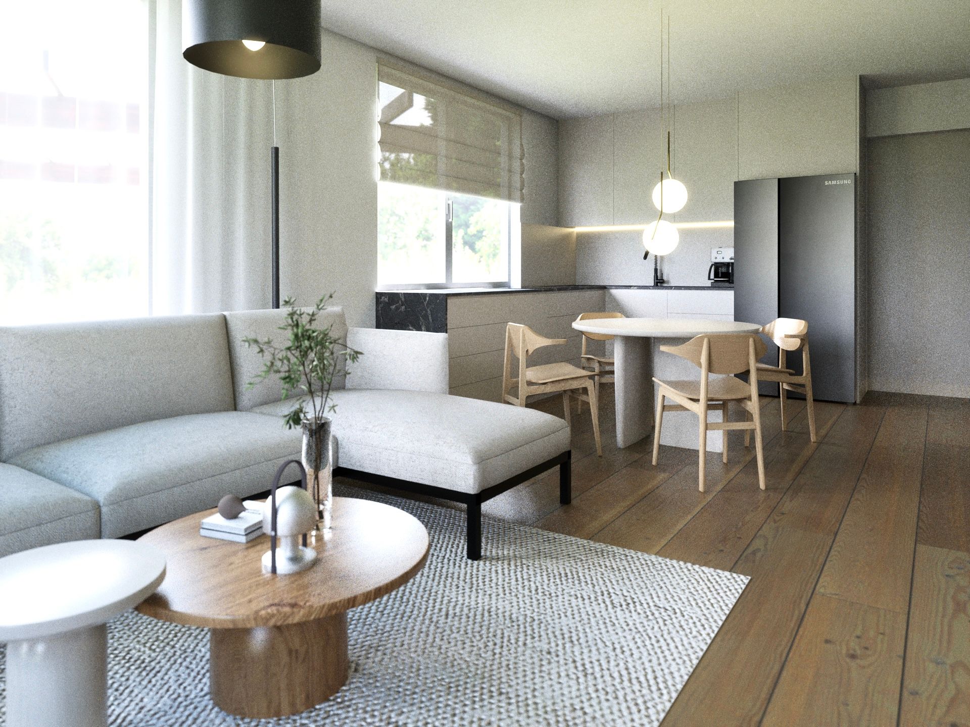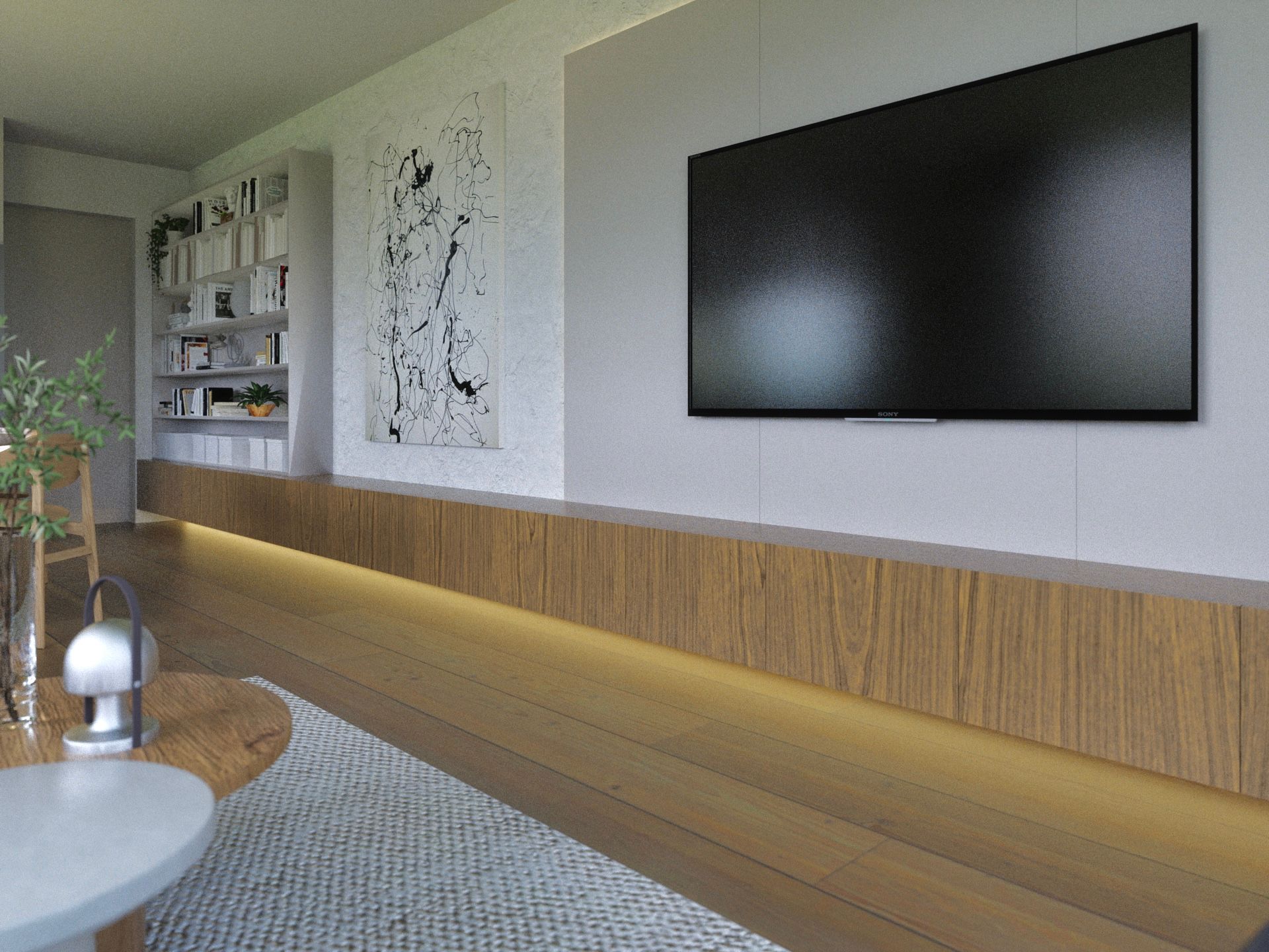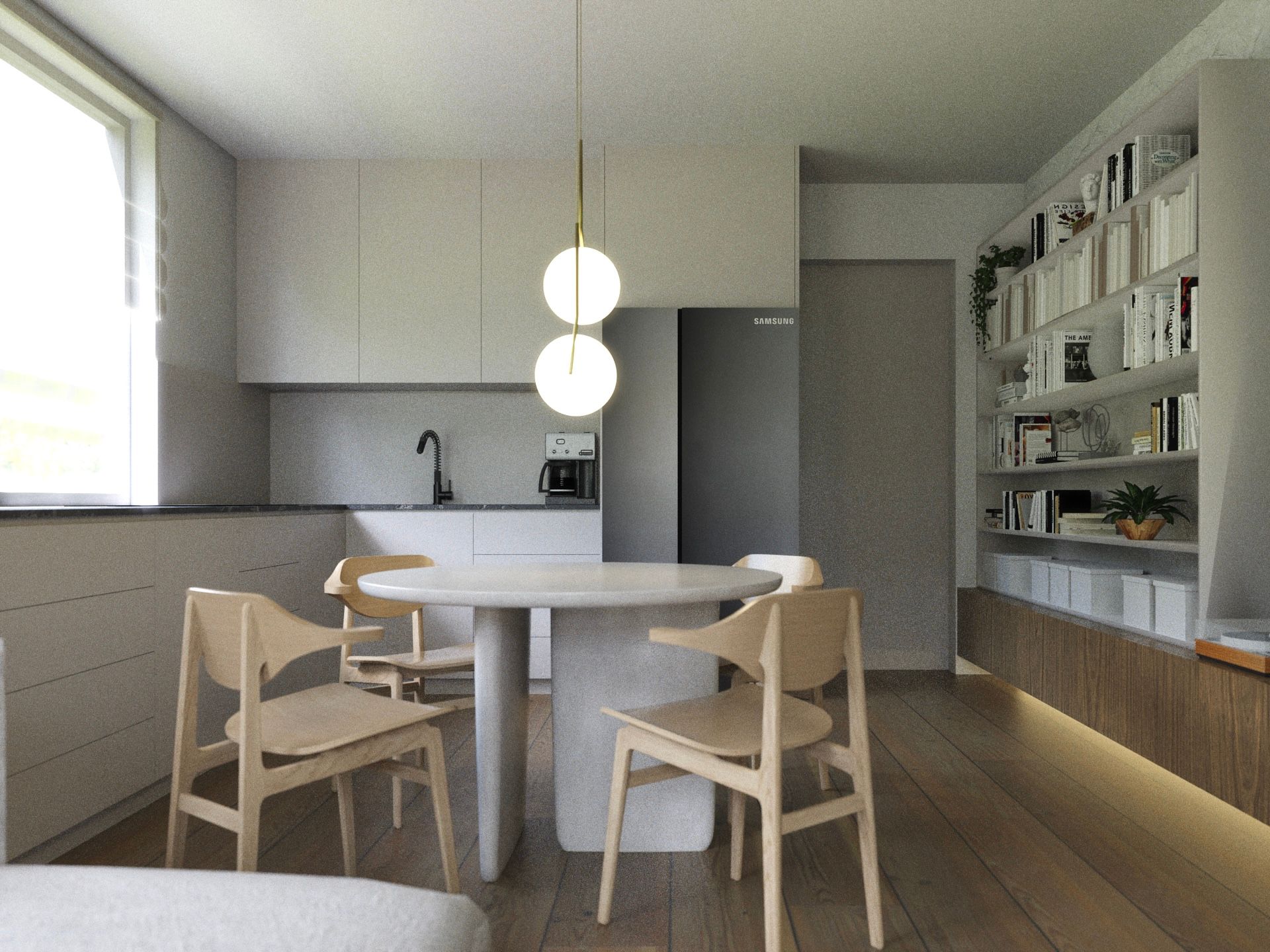 Denná časť v dome je priestor, kde rodina trávi najviac času, slúži na spoločné stolovanie, relax aj prijímanie návštev. Hoci ide menší dom, dennú časť potrebuje mať navrhnutú tak, aby spĺňala svoju funkciu a poskytovala príjemnú atmosféru domova. Kombinácia orechového dreva, béžových odtieňov a čiernych akcentov zaisťuje priestoru vzdušnosť, organickosť a rozloženie zariaďovacích prvkov zas prináša dostatok praktického využitia miestnosti.