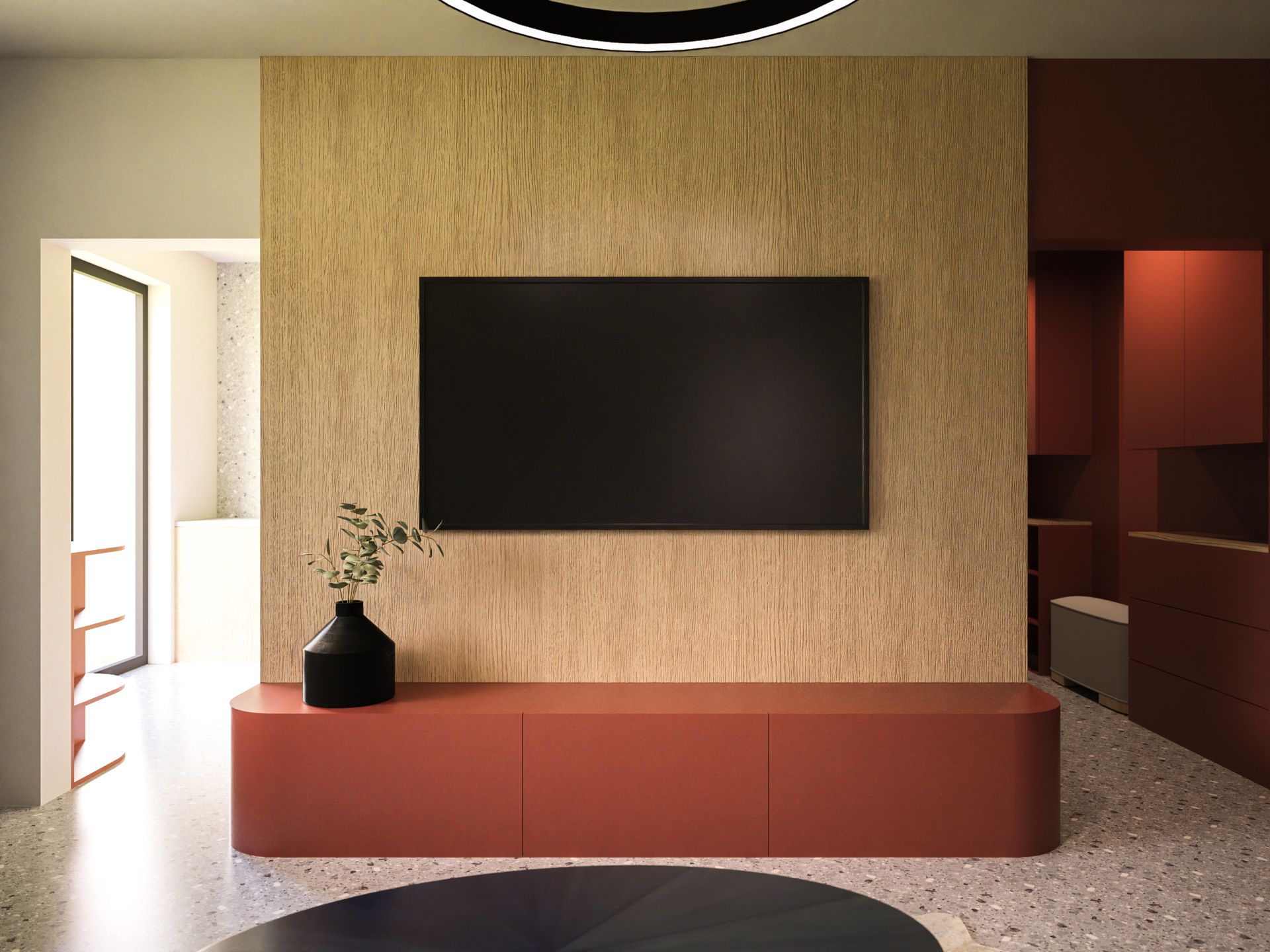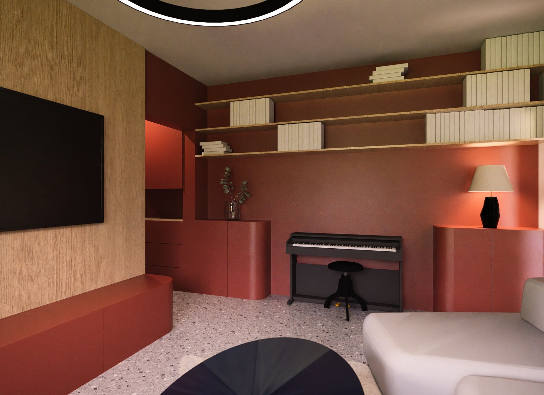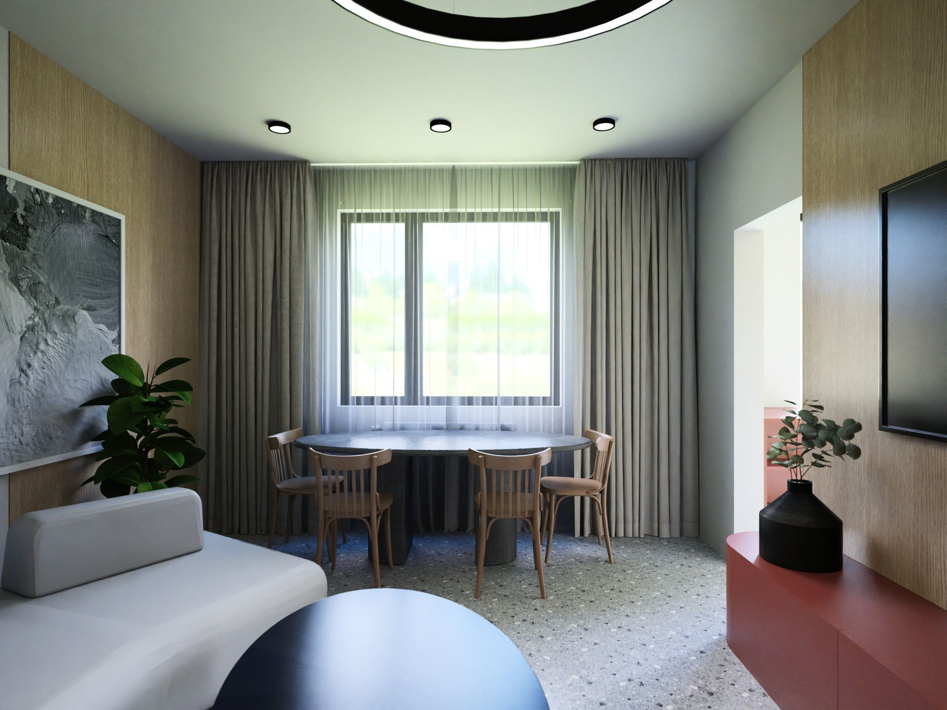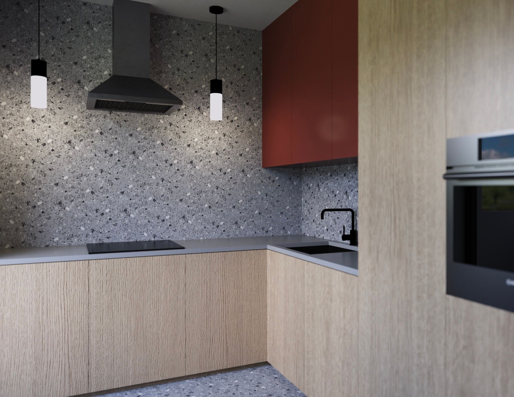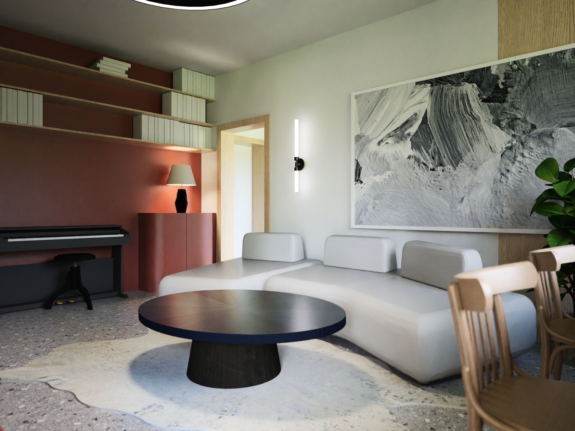 Mierny zásah do pôvodnej dispozície pôvodného bytu zo 70tych rokov minulého storočia priniesol mladej rodine vzdušný a funkčný priestor. Dizajnová idea majiteľov bolo vytvorenie moderného priestoru, ktorý by ale v detailoch odkazoval na obdobie vzniku bytu. K tomu poslúžili farby (sivá s akcentujúcou červenohnedou), materiály (leštený betón a terazzo) aj niektoré nábytky (napr. stoličky pôvodného dizajnu svetoznámej firmy Ton). Detská izba a spálňa sa zase riadi preferenciami a charakterom jej obyvateľov, farby sa zjemňujú a atmosféra zútulňuje. Kombinácia moderných prvkov s odkazmi na minulé dizajnové obdobia je spojenie, ktoré ak sa vkusne a s citom zrealizuje, vie priniesť zaujímavý a originálny charakter priestoru.