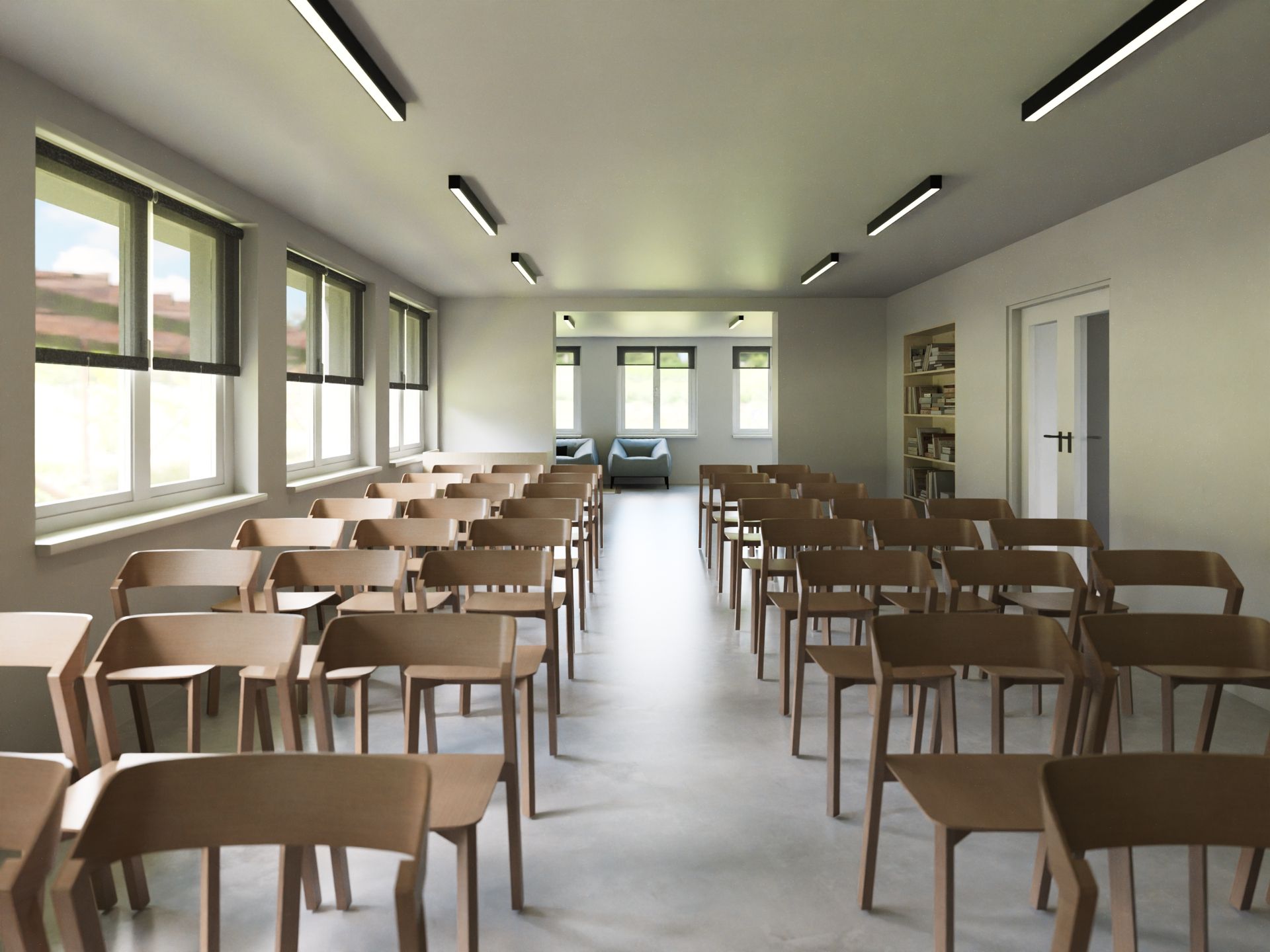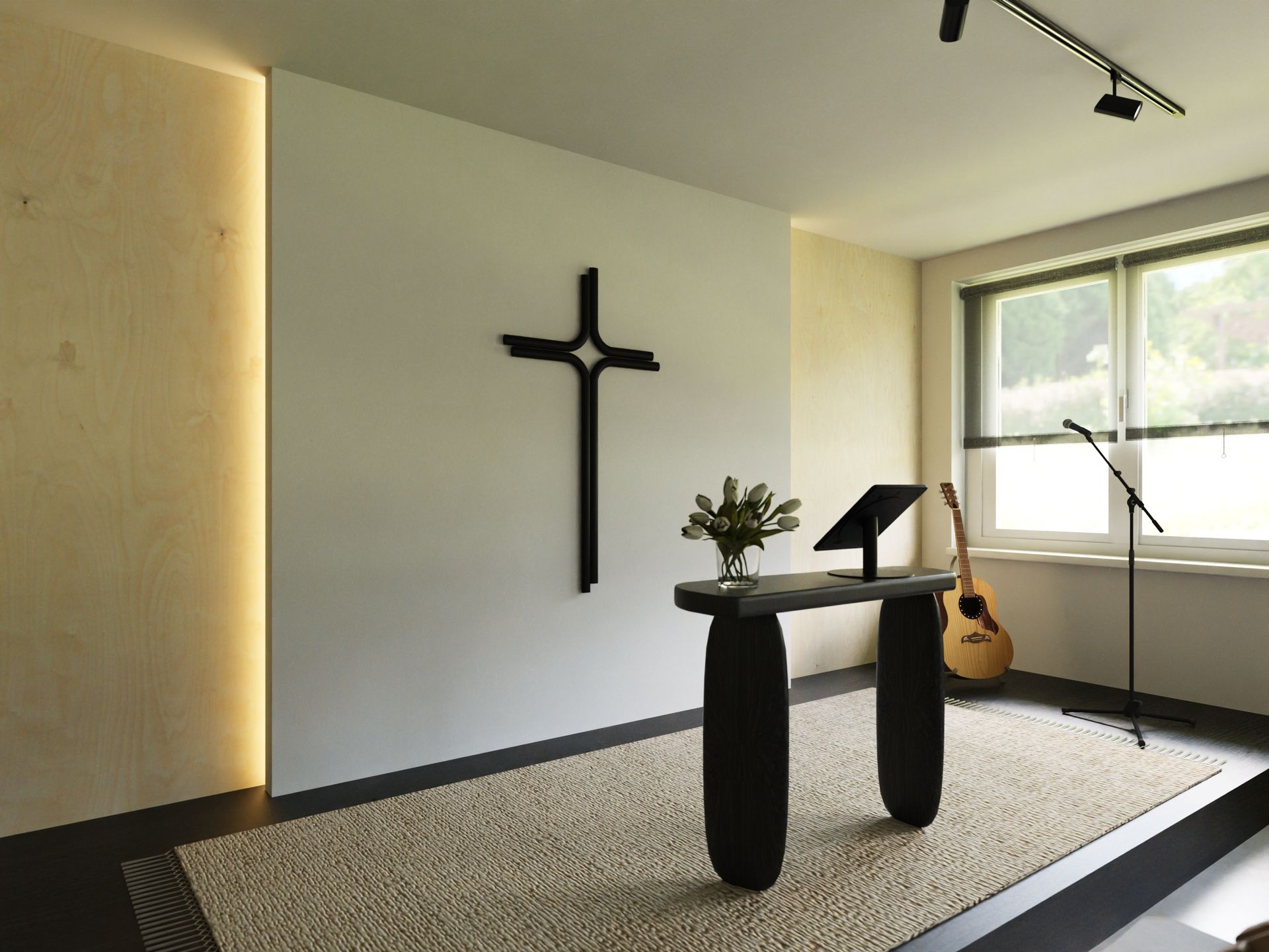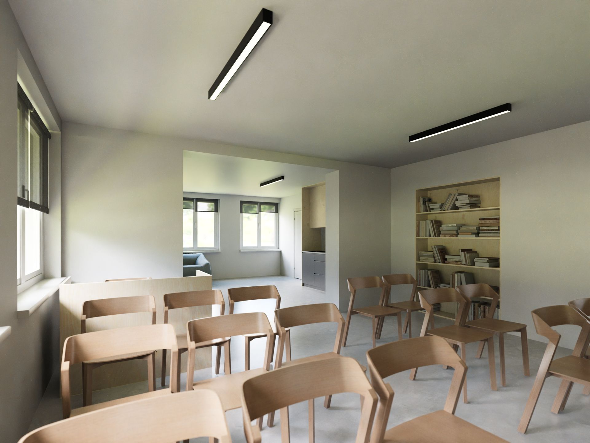Cieľom tohto zaujímavého projektu bolo vytvorenie multifunkčného priestoru pre komunitu, ktorá sa stretáva každú nedeľu na bohoslužby a zároveň má počas týždňa rôzne aktivity pre mladých aj deti. Pôvodná knižnica ešte z čias socializmu, ktorá v týchto priestoroch pred tým sídlila potrebovala celkovú rekonštrukciu a čiastočnú zmenu dispozície. Napriek obmedzeným priestorovým možnostiam však vďaka použitým farbám a materiálom (prevažne svetlých odtieňov prírodného charakteru) vznikla pomerne veľká spoločenská miestnosť, jedálenská časť s kuchynským kútikom (s možnosťou predelenia pre vytvorenie „klubovne“), miestnosť pre deti a priestranná chodba s úložným priestorom.
